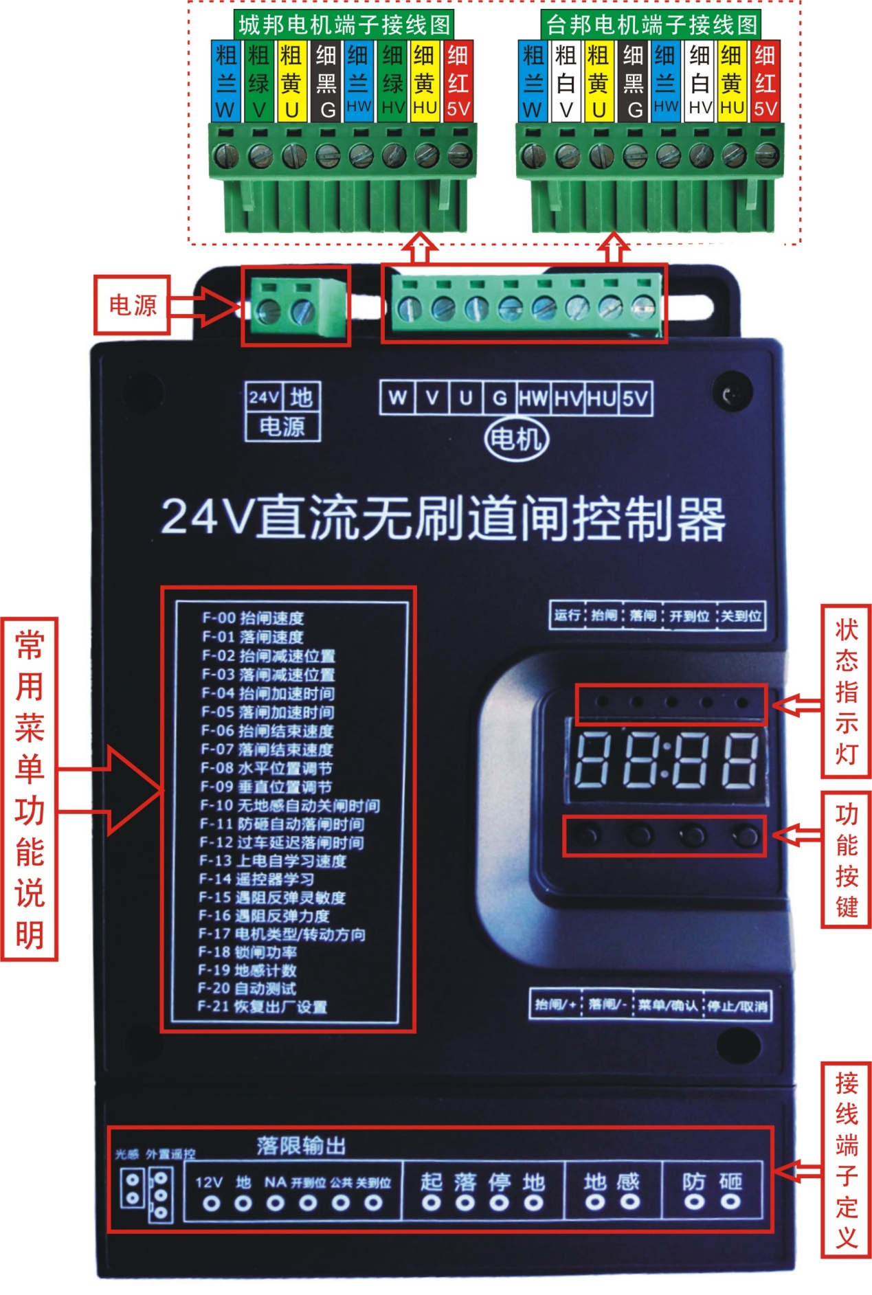 一般情況下在0和1之間選擇,當按“抬閘/+”按鍵道閘起桿,則說明電機類型和轉動方向的選擇是正確的。城邦電機在0、1之間選擇,臺邦電機在2、3之間選擇。